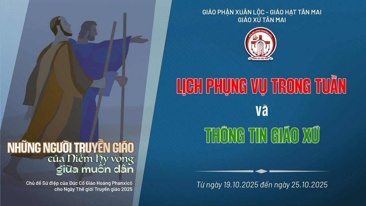 1/ Chúa Nhật 19/10/2025: Hôm nay là ngày cầu nguyện cho công cuộc truyền giáo của Giáo Hội. Xin quý cộng đoàn cầu nguyện và quảng đại đóng góp cho công cuộc loan báo Tin Mừng của Giáo Hội.