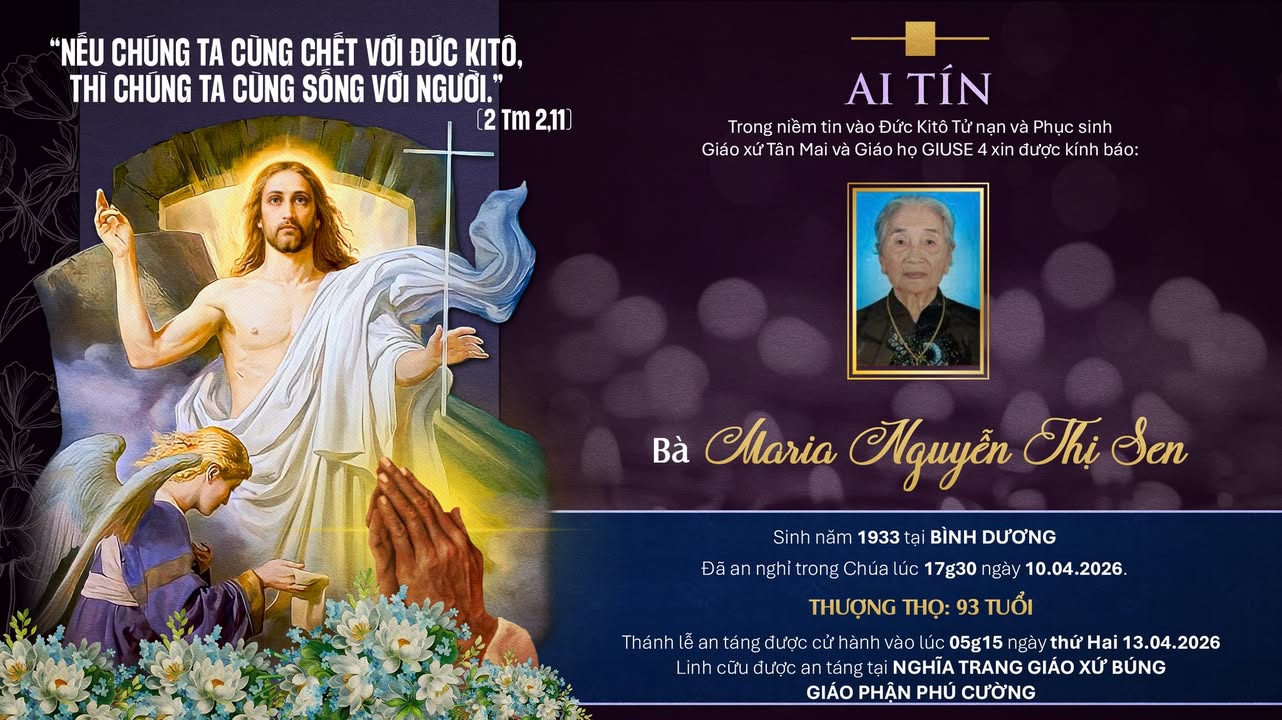 Sinh năm 1933 tại Bình Dương Đã an nghỉ trong Chúa lúc 17g30 ngày 10.04.2026. Thượng thọ 93 tuổi.
